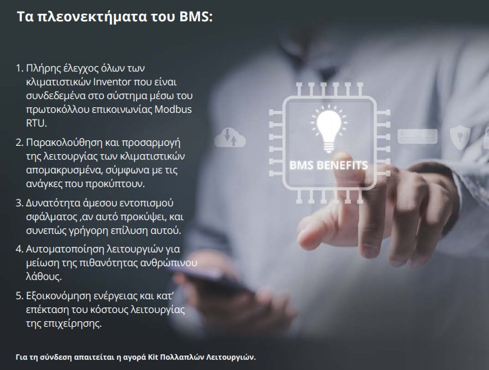 Όλα τα κλιματιστικά Inventor που είναι συνδεδεμένα στο σύστημα ελέγχονται κεντρικά μέσω του πρωτοκόλλου επικοινωνίας Modbus RTU, προσφέροντας: